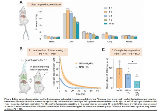 驗證新策略可行性:利用Pd NPs的肝靶向蓄積、H?捕獲存儲及催化·OH氫化能力(·OH + H? → H?O),實現肝部局部高效抗炎。
