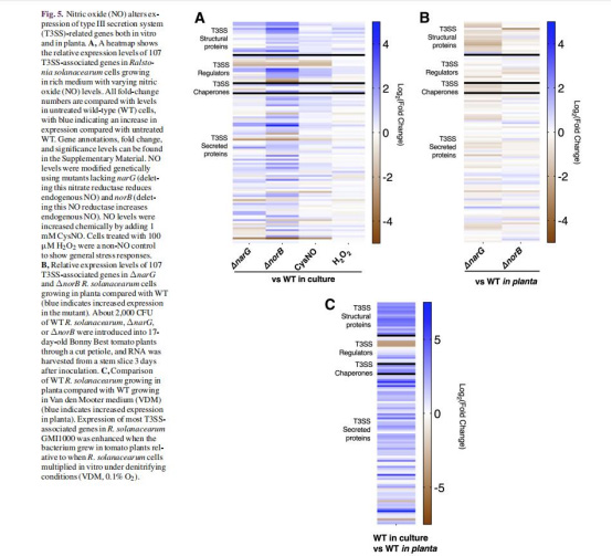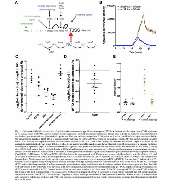 NO是T3SS的關(guān)鍵激活信號:青枯菌通過反硝化產(chǎn)生的NO直接上調(diào)hrpB表達(dá),進(jìn)而激活T3SS基因簇,優(yōu)化毒力效應(yīng)因子的分泌。