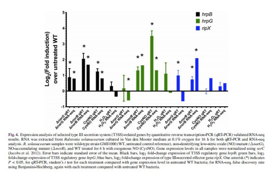 在番茄感染模型中,ΔnarG(低NO)導(dǎo)致9個(gè)T3SS基因(包括hrpB、hrpF)表達(dá)下調(diào)(圖5B)。