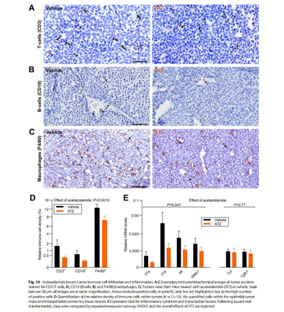 CA抑制劑乙酰唑胺(ATZ) 加劇腫瘤酸化(pH降至6.8),減少免疫細胞浸潤(CD3?T細胞、CD19?B細胞、F4/80?巨噬細胞降低50%),抑制炎癥因子(IL1a/IL1b/IL6、NFκB1),并加速ErbB2誘導的小鼠乳腺癌生長(體積增長20倍 vs 對照10倍)。