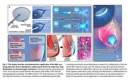 本研究開發了一種名為 iCarP 的可生物降解柔性光子貼片,通過創新性地在錐形光纖(TOF)與聚酯貼片(PMCL)間構建微米級空氣間隙,實現了非侵入性、大面積、深穿透的光照調控。iCarP 結合了光纖的衍射、空氣間隙的雙重折射及貼片內反射,形成“燈泡式”照明模式,可將光高效導向目標組織。實驗證明,iCarP 支持廣譜、高強度、連續/脈沖式光照,穿透深度達1.5 cm,適用于不同光敏劑的光療(如光熱治療、光合作用治療)。其兼容微創胸腔鏡手術植入,在跳動的心臟上穩定工作,為內臟器官的光學診療提供了安全、精準的平臺。