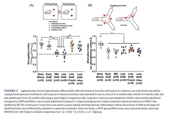 數(shù)據(jù):老年SHR的NOR識(shí)別指數(shù)顯著降低(p<0.01),卡托普利和阿魏酸部分挽救長(zhǎng)期記憶(圖1A);Y迷宮工作記憶在SHR中持續(xù)受損且治療無(wú)效(圖1B)。
