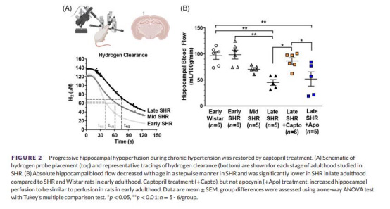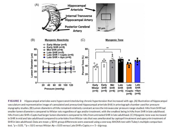 關(guān)鍵機(jī)制:血管緊張素II信號(hào)通路是核心驅(qū)動(dòng)因素——ACE抑制劑卡托普利(captopril)恢復(fù)海馬血流、改善血管功能并挽救記憶,而抗氧化劑阿魏酸(apocynin)無(wú)效。