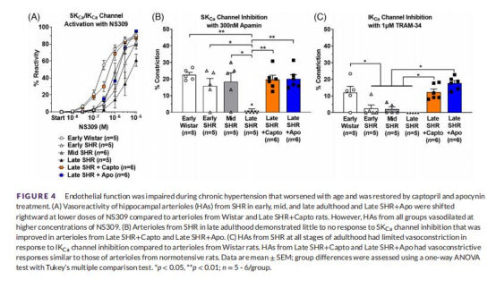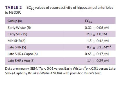 SKCa/IKCa通道功能(NS309響應(yīng)):老年SHR反應(yīng)右移(EC50升高,表2),卡托普利完全恢復(fù)(圖4A)。