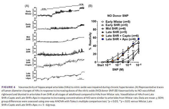 NVC反應(yīng):腺苷(圖5B)和一氧化氮(圖6B)介導(dǎo)的舒張?jiān)赟HR中受損,兩種治療均改善。
