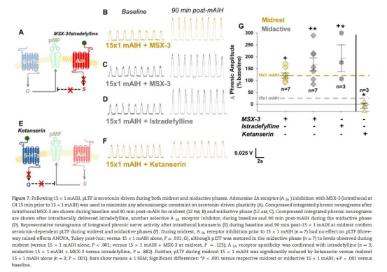 低氧時長效應:短時低氧(1分鐘)比長時低氧(5分鐘)誘發更少的腺苷釋放,從而在休息期增強血清素主導的pLTF。