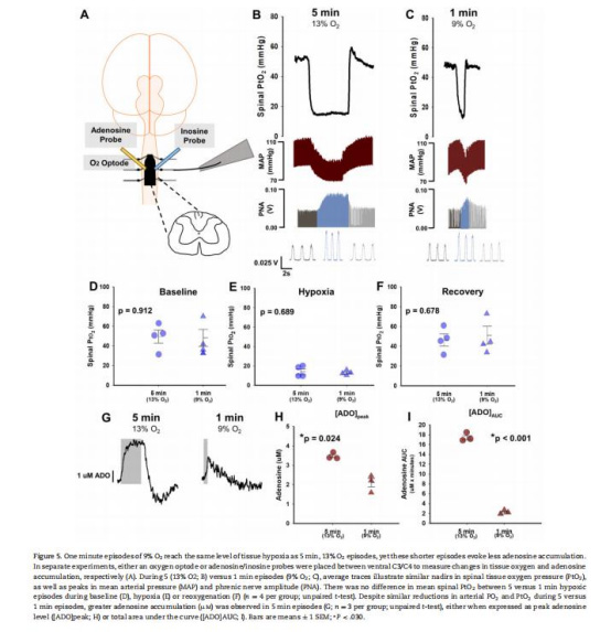 證實1分鐘9% O?與5分鐘13% O?達到相同的脊髓PtO?(~13 mmHg),但1分鐘低氧腺苷釋放減少52%(圖5H)。