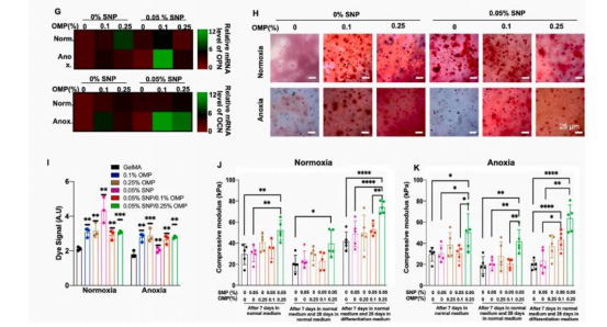 缺氧條件下的成骨增強:OMP水凝膠在常氧(5%O?)和嚴重缺氧(<0.2%O?)環境下均顯著提升hMSCs的成骨標志物表達(ALP、OCN、OPN)和鈣沉積。