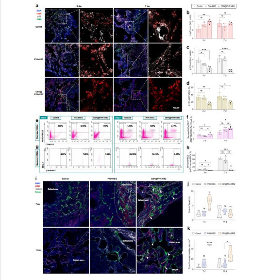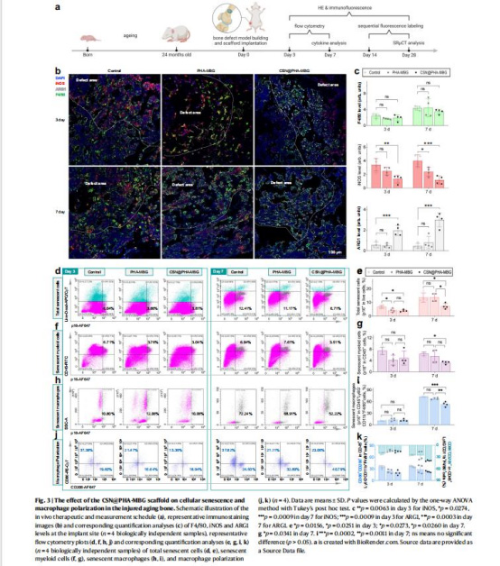 CSN@PHA-MBG組BMSCs招募量↑2.8倍(圖5f),衰老BMSCs比例↓70%(圖5h)。