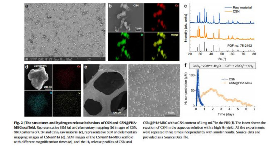 創新支架設計:開發了聚羥基脂肪酸酯(PHA)包裹硅化鈣納米顆粒(CSN)負載的中孔生物活性玻璃支架(CSN@PHA-MBG),實現高劑量H?緩釋(911 mL/g,持續7天)。