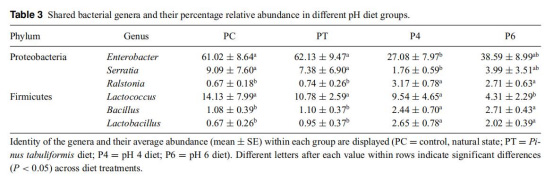 偏離天然pH(pH 4.7)的飼料(pH 4或6)顯著改變腸道pH,降低優勢菌豐度(如 Enterobacter ↓50%)和verbenone產量(↓70%)。