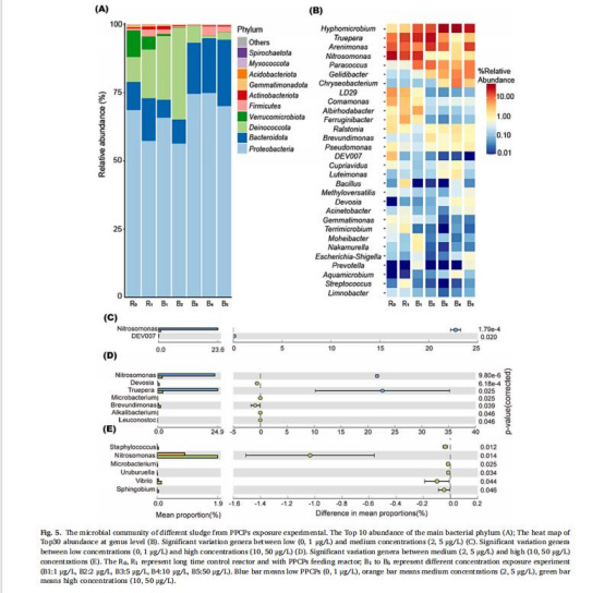 3. 微生物響應:低濃度PPCPs降低多樣性,高濃度增加多樣性但改變群落結構(如Nitrosomonas銳減);共現網絡揭示微生物協同抗逆機制。