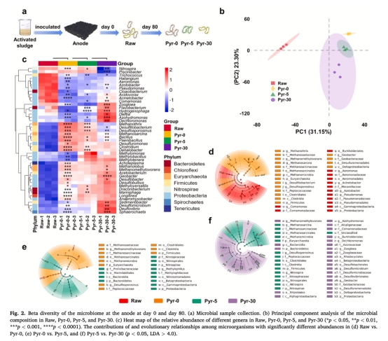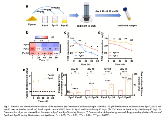 數(shù)據(jù):高芘濃度(Pyr-30)下pH下降緩慢(酸化解離減少),TOC降解率降低(圖1c,d),芘降解效率顯著低于Pyr-5(圖1f)。