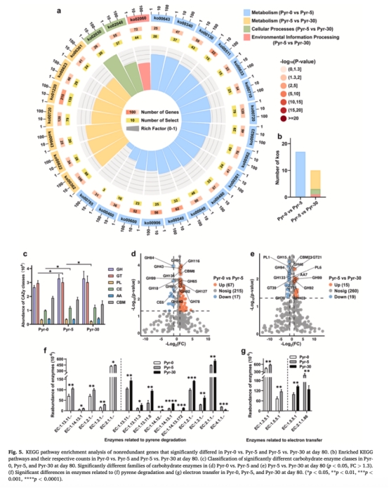 數(shù)據(jù):低芘濃度(Pyr-5)激活碳水化合物代謝酶(如糖基轉(zhuǎn)移酶GTs);高芘濃度(Pyr-30)抑制外膜電子傳遞酶(EC:2.1.1.86),同時芘降解酶多樣性增加(圖5f)。