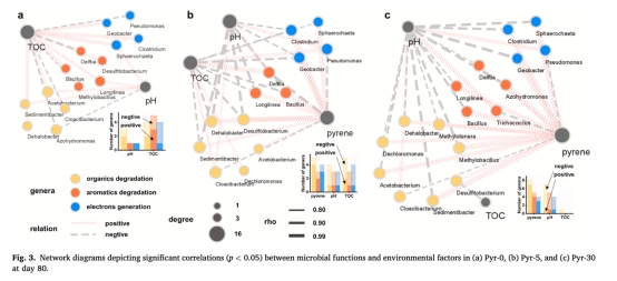 關(guān)聯(lián)微生物群落結(jié)構(gòu)(PCA、LDA分析)與環(huán)境因子(pH、TOC、芘降解效率)的網(wǎng)絡(luò)關(guān)系(圖3)。
