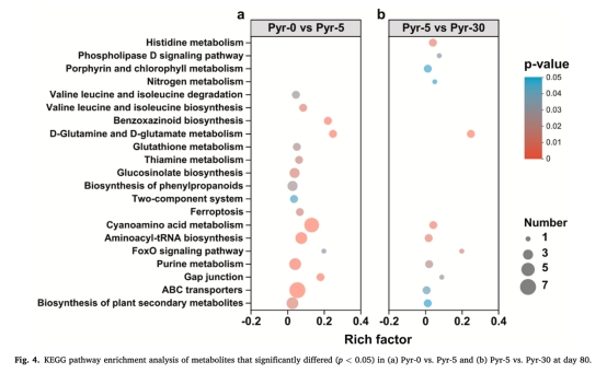 測量顯示高芘組(Pyr-30)pH下降滯后(圖1b),表明微生物有機質(zhì)礦化活性受抑制,與TOC降解率降低(圖1c)和代謝組學(xué)中碳通路上調(diào)減弱(圖4a)相互驗證。