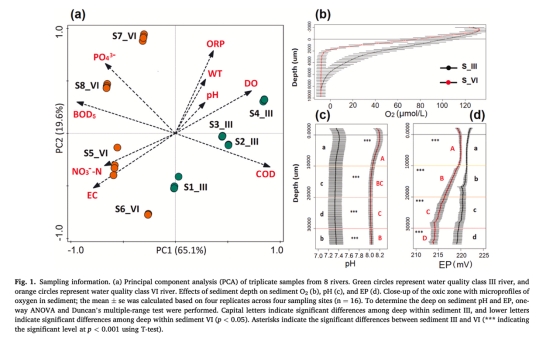 揭示污染沉積物中溶解氧滲透深度顯著變淺(1.25mm vs 清潔組5.5mm,圖1b),這直接限定了好氧/厭氧微生物的生存空間;