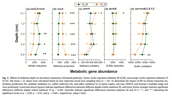pH垂直剖面(圖1c)顯示污染環境堿性增強(pH 8.06 vs 清潔組7.24),影響硫化物化學形態及微生物代謝途徑;