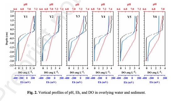 氧化還原精細刻畫:通過毫米級分辨率剖面(圖2)揭示SWI處DO驟降(上覆水→沉積物從5 mg/L降至<1 mg/L),明確厭氧環境主導沉積物深層,解釋Fe/Mn氧化物還原溶解導致As/Cd釋放的機制。