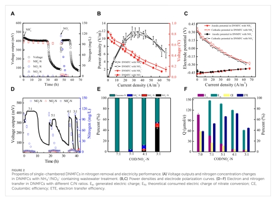 電化學(xué)性能數(shù)據(jù):電壓輸出、極化曲線、功率密度(圖2A-F)。意義:量化DNMFC的產(chǎn)電穩(wěn)定性(最大功率密度58.2 W/m3)及硝酸鹽對循環(huán)時間的縮短效應(yīng)(含NO??時循環(huán)時間縮短50%)。來源圖2。