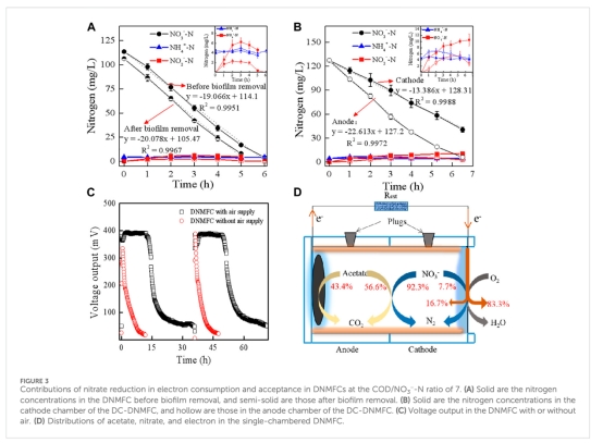 脫氮路徑創(chuàng)新:DNMFC以異養(yǎng)反硝化為主(92.3% NO??去除),電化學(xué)還原為輔(7.7%);氧氣是主要電子受體(消耗83.3%電子),硝酸鹽僅消耗16.7%。