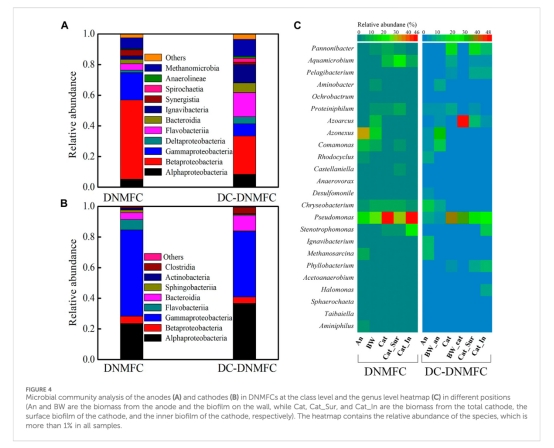 陽極生物膜:固氮弓菌屬(Azonexus,33.1%)主導(dǎo)(圖4C)。