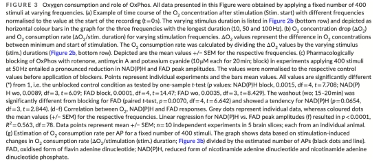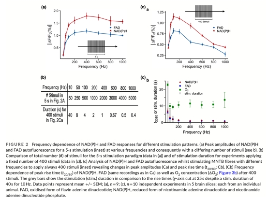 對(duì)比數(shù)據(jù):>100 Hz時(shí)NAD(P)H/FAD峰值飽和而氧消耗率持續(xù)增加(圖3d-e)。
