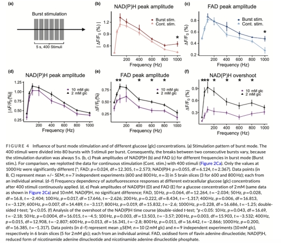 爆發(fā)式刺激模式(固定時(shí)長(zhǎng))與連續(xù)刺激的代謝響應(yīng)無(wú)顯著差異,支持平均放電頻率(而非時(shí)間模式)主導(dǎo)能量需求(圖4b-c)。