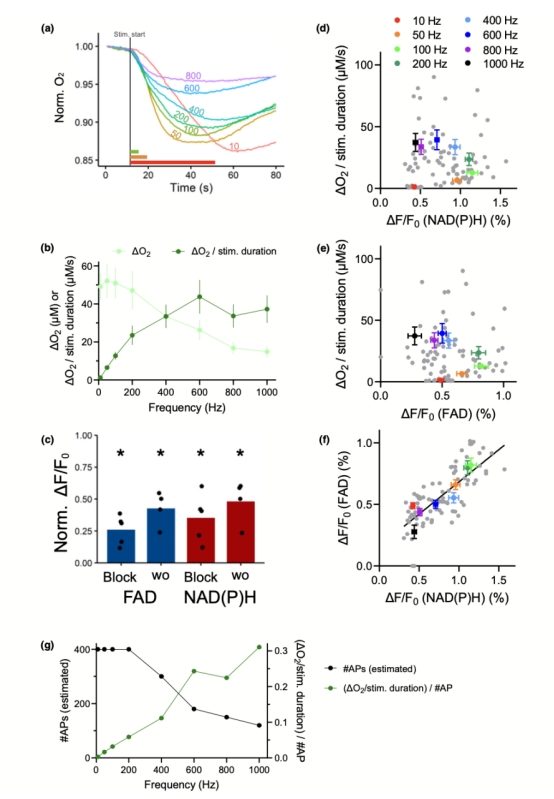 關(guān)鍵發(fā)現(xiàn):在300–1000 Hz刺激下,盡管突觸傳遞可靠性下降(動(dòng)作電位發(fā)放數(shù)減少),氧消耗率仍持續(xù)上升(圖3g)。