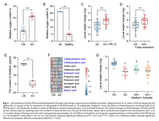 腸道氧濃度(圖2A-B):CN幼蟲腸道氧濃度為5%(與蟲道環(huán)境一致),AX幼蟲升至10%。意義:揭示細菌通過呼吸作用創(chuàng)造低氧微環(huán)境。