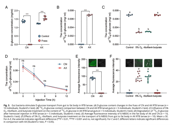 葡萄糖轉運能力(圖3A-E):AX幼蟲糞便殘留D-葡萄糖,且熒光探針6-NBDG在脂肪體無累積。意義:細菌缺失阻斷葡萄糖從腸道向脂肪體的轉運。