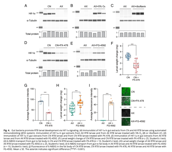 Hif-1α蛋白表達(圖4A-E):AX幼蟲腸道Hif-1α蛋白缺失,低氧或核黃素處理可恢復其表達。意義:細菌通過低氧和核黃素穩(wěn)定Hif-1α。