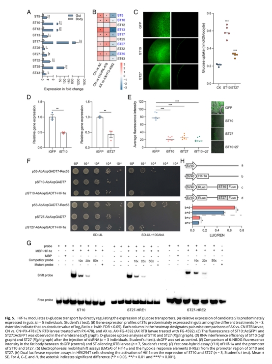 論文發(fā)現(xiàn)紅脂大小蠹(RTB)的腸道細菌通過誘導腸道低氧和分泌核黃素,激活低氧誘導轉錄因子1(Hif-1α),進而上調兩種葡萄糖轉運蛋白(ST10和ST27)的表達,促進D-葡萄糖從腸道向脂肪體的轉運,最終驅動幼蟲發(fā)育。缺乏腸道細菌導致葡萄糖轉運受阻,幼蟲發(fā)育異常。
