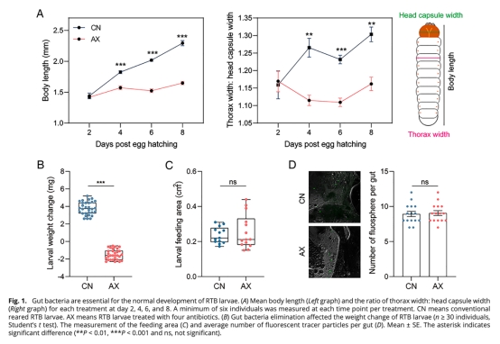 比較無菌(AX)與常規(guī)(CN)飼養(yǎng)RTB幼蟲的發(fā)育表型,確認腸道細菌的必要性。