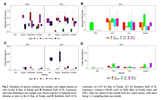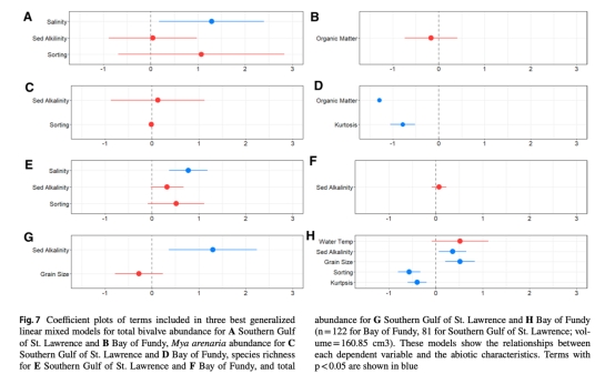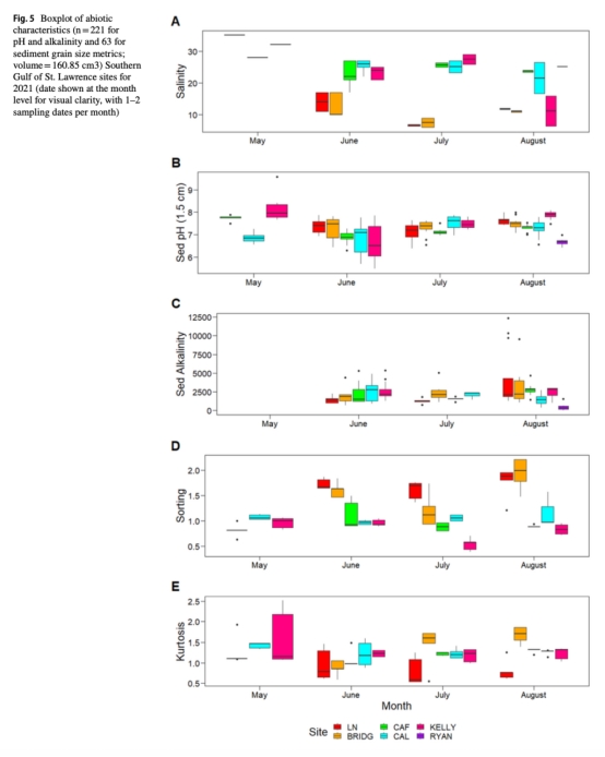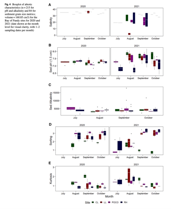 論文研究了加拿大新不倫瑞克省兩個潮間帶區(qū)域(芬迪灣和圣勞倫斯灣南部)水體與沉積物非生物因子(鹽度、沉積物粒度、碳酸鹽化學(xué)等)對底棲無脊椎動物群落及雙殼類幼體豐度的影響。研究發(fā)現(xiàn)碳酸鹽化學(xué)參數(shù)(尤其沉積物pH和堿度)解釋了群落變異的7-44%,其中芬迪灣沉積物pH解釋力最強(16.9%),圣勞倫斯灣鹽度解釋力最突出(9.8%)。堿度(水體或沉積物)在所有模型中均顯著,表明其對底棲生物的關(guān)鍵作用。