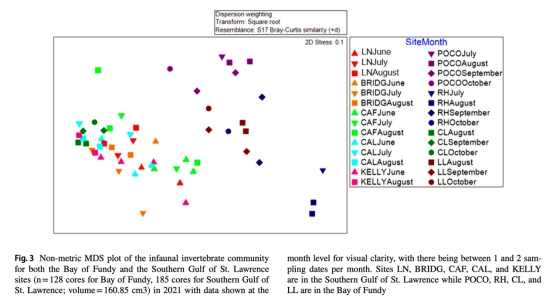 物種豐富度與豐度(圖2):圣勞倫斯灣站點豐富度顯著低于芬迪灣(p<0.001)。意義:揭示區(qū)域環(huán)境差異對生物多樣性的塑造作用。