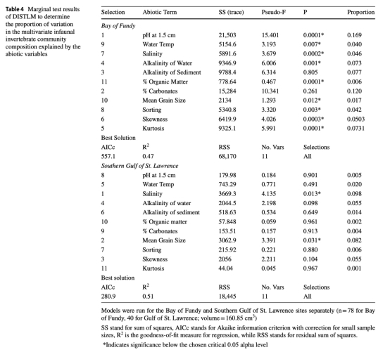DISTLM結(jié)果(表4):沉積物pH解釋芬迪灣群落變異的16.9%,鹽度解釋圣勞倫斯灣變異的9.8%。意義:識別關(guān)鍵區(qū)域特異性驅(qū)動因子。