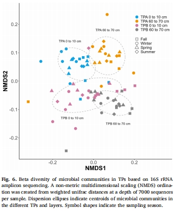 群落穩(wěn)定性:活性微生物群落結(jié)構(gòu)主要受泥炭地和深度影響,季節(jié)變化不顯著(圖6)。