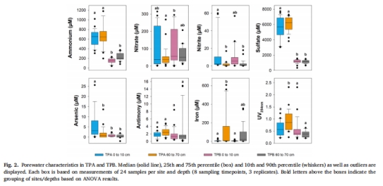 孔隙水:鐵在深層釋放顯著(圖2);砷/銻去除率全年穩(wěn)定(TPA >90%,TPB ~50%),氮/硫酸鹽去除率夏季更高(圖4)。