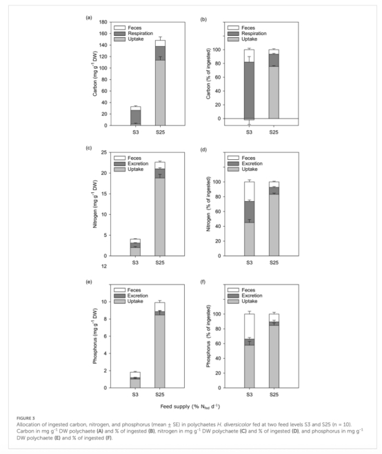 本研究通過(guò)喂食鮭魚幼體養(yǎng)殖污泥,量化了多毛類沙蠶(Hediste diversicolor)在個(gè)體水平上的碳(C)、氮(N)、磷(P)營(yíng)養(yǎng)流動(dòng)。實(shí)驗(yàn)設(shè)置低(S3)和高(S25)兩種投喂水平,測(cè)量了攝食、排泄、呼吸及生長(zhǎng)相關(guān)的營(yíng)養(yǎng)分配。結(jié)果表明:高投喂組沙蠶將76–85%的攝入營(yíng)養(yǎng)轉(zhuǎn)化為生長(zhǎng)所需,而低投喂組因營(yíng)養(yǎng)限制,碳主要用于呼吸代謝。營(yíng)養(yǎng)流動(dòng)受元素類型和投喂量顯著影響,證實(shí)沙蠶可高效轉(zhuǎn)化污泥養(yǎng)分,為水產(chǎn)廢物資源化提供依據(jù)。
