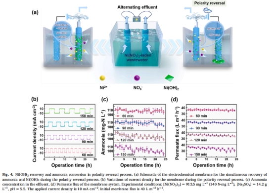 工藝優化:對比不同極性反轉周期(60/90/120/150 min)對氨轉化率(92.9%)和Ni(OH)?回收率(92.2%)的影響(圖4)。
