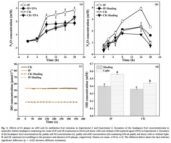 鐵膜處理組(IP)·OH濃度比對(duì)照組(CK)高1.5-2倍(圖1d-e),N?O排放量高2-3倍(圖1f),N?O/(N?O+N?)比率高3倍(圖1h)。