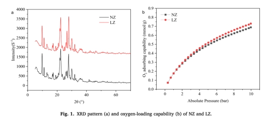 材料特性數據,包括BET表面面積、氧負載能力和XRD圖譜(來自Fig. 1)。研究意義:評估材料的物理化學特性,如LZ的氧負載能力(0.73 mmol/g)高于NZ,顯示鑭改性提高了材料對氧的吸收效率,為后續氧補充機制提供基礎(Fig. 1b顯示氧負載能力與壓力正相關)。