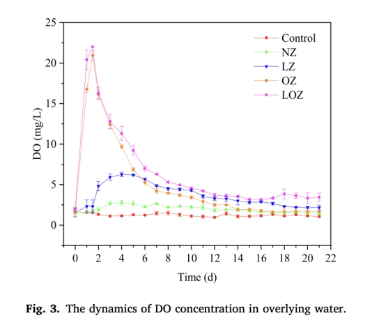 DO濃度在上覆水中的動態變化(來自Fig. 3)。研究意義:監測LOZ應用后DO水平的改善(從初始<1 mg/L升至3-5 mg/L),證明氧持續釋放有效緩解缺氧場景,并為生物過程(如硝化)創造條件(Fig. 3顯示LOZ組DO維持較高水平)。