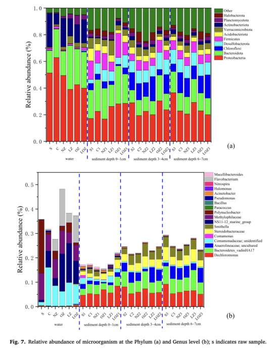 微生物群落數據(來自Fig. 7)。研究意義:分析門和屬水平的微生物組成(如LOZ組表層沉積物中Dechloromonas豐度增加),揭示微生物群落變化與氮循環(硝化和反硝化)的關聯,解釋生物去除機制(Fig. 7a-b顯示氧誘導的菌群演替)。