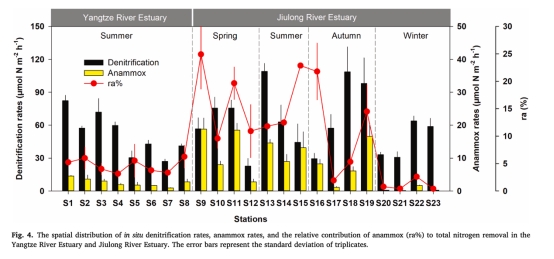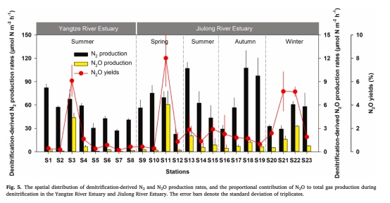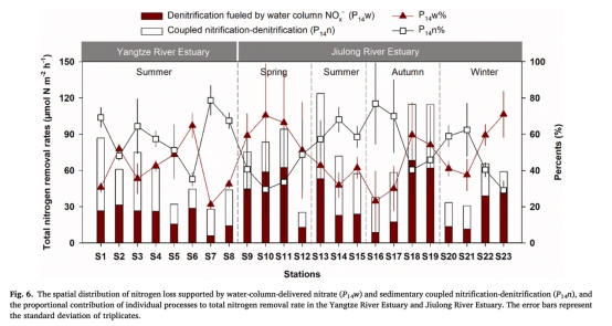 來源:圖4(反硝化、厭氧氨氧化速率及時空分布)、圖5(反硝化衍生的N2和N2O產率)、圖6(水柱NOx支持與沉積物硝化支持的氮去除貢獻)