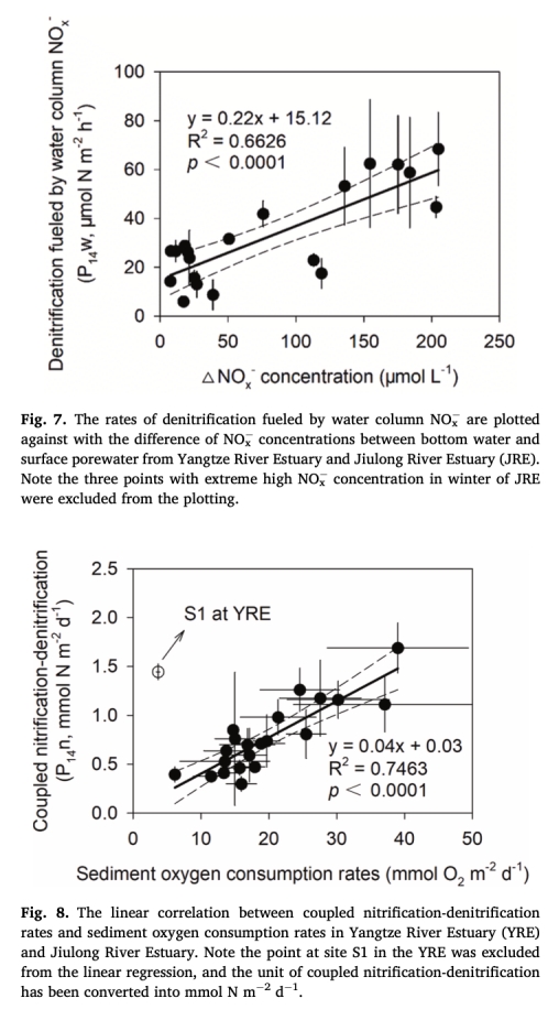 來源:圖7(水柱NOx擴散驅動的反硝化與底水-孔隙水NOx梯度關系)、圖8(硝化-反硝化耦合與SOC的線性關系)
