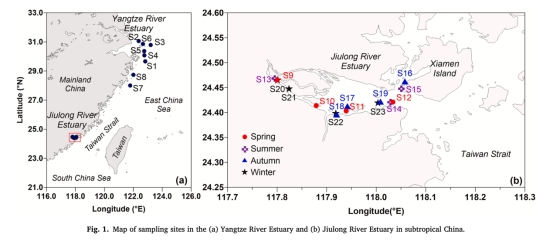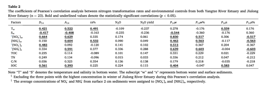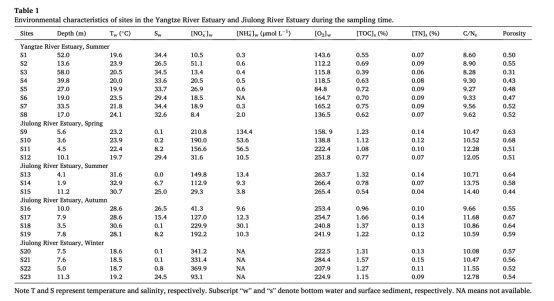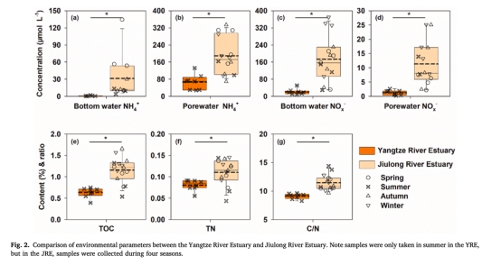 意義:揭示九龍江口富營養化程度更高(NOx和NH4濃度、TOC含量顯著高于長江口),為氮去除速率空間差異提供背景依據。