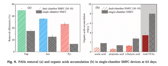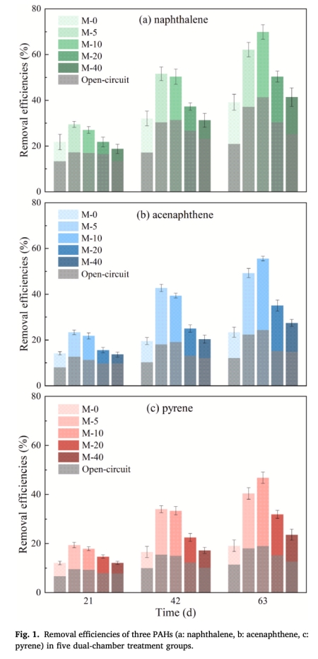 來源:圖1(雙室SMFC中三種PAHs動態(tài)去除曲線)、圖9a(單室裝置PAHs去除率)