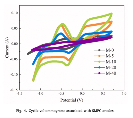 意義:揭示系統(tǒng)能量轉(zhuǎn)化效率。適量淀粉提升峰值電壓至478 mV(圖2),降低內(nèi)阻至719–733 Ω(圖3),增強電子轉(zhuǎn)移能力(圖4氧化峰電流64.2 mA);過量淀粉削弱電活性菌功能,導致性能衰減。